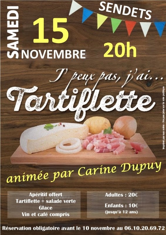 L'équipe du Foyer Rural vous propose le Samedi 15 Novembre 2025 une soirée Tartiflette animée par Carine Dupuy, à la Salle Communale à 20 Heures.