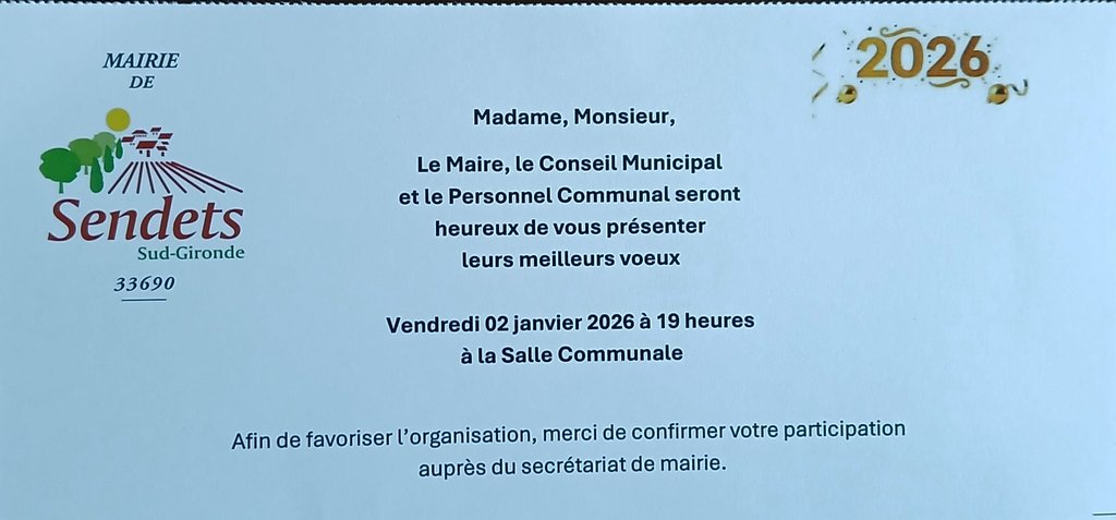 INVITATION AUX HABITANTS POUR LA CÉRÉMONIE DES VOEUX DU 02 JANVIER 2026 À 19 HEURES