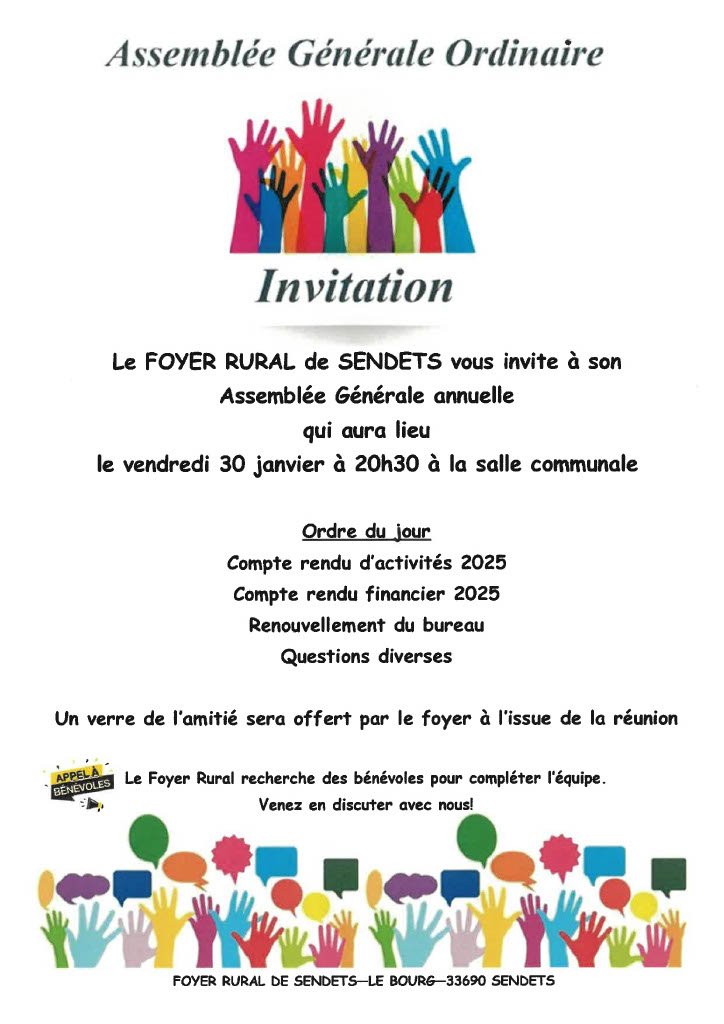 Vous trouverez ci-joint l'invitation du Foyer Rural de Sendets à son Assemblée Générale 2026,