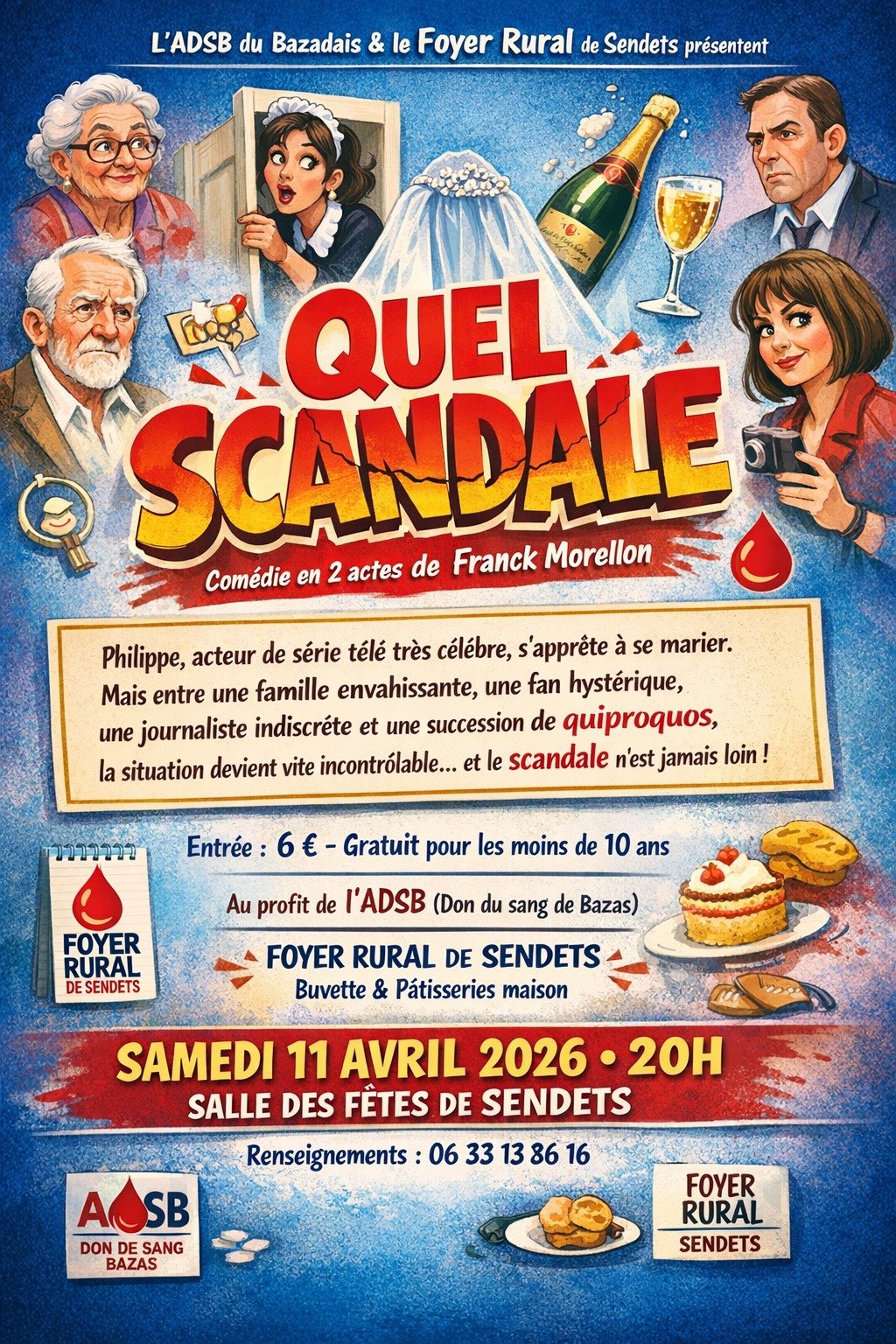 Comme tous les ans le Foyer Rural de Sendets organise au profit de l'Association des Donneurs de Sang du Bazadais une soirée Théâtre, elle aura lieu le Samedi 11 Avril 2026 à 20 Heures, à la Salle Communale.