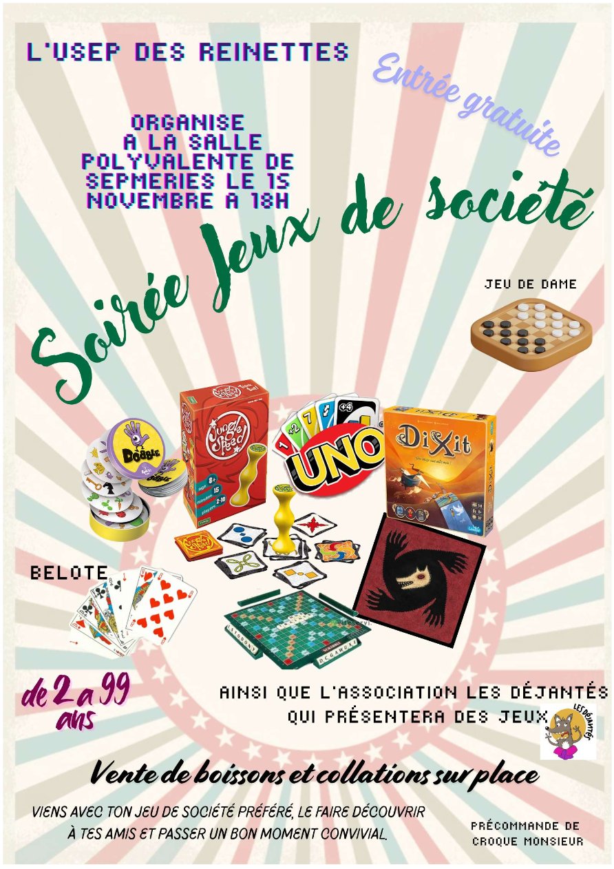 L'association USEP des REINETTES vous invite à une soirée jeux de société le samedi 15 novembre à partir de 18h00, à la salle polyvalente.