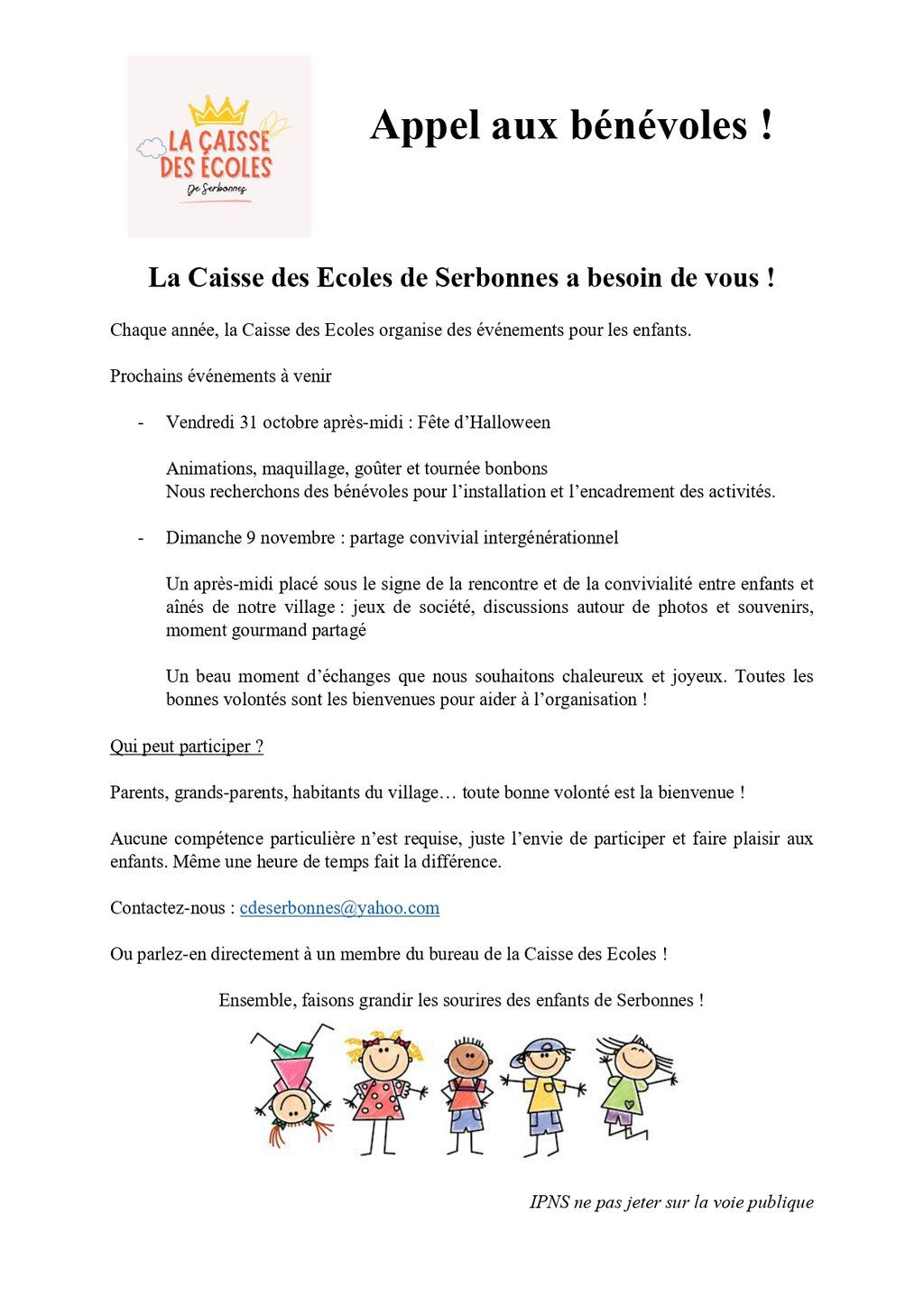 APPEL AUX BÉNÉVOLES POUR LA CAISSE DES ECOLES