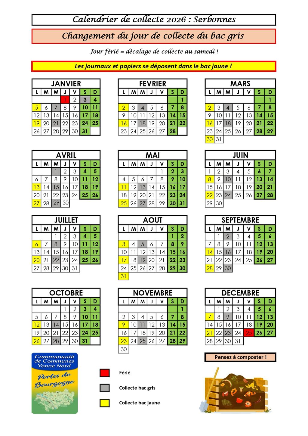CALENDRIER DE COLLECTE 2026 DES BACS GRIS ET JAUNES À SERBONNES