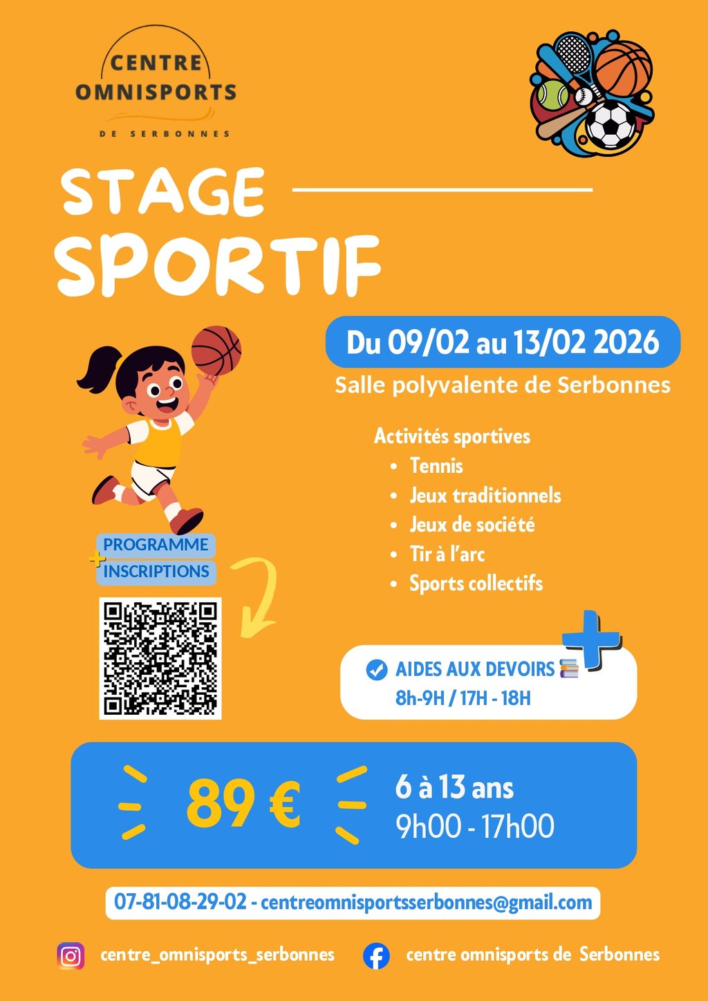 Pour les vacances d’hiver, un stage multisports est organisé du 9 au 13 février 2026 à la salle des fêtes de Serbonnes, de 9h à 17h, avec accueil possible de 8h à 9h et de 17h à 18h.