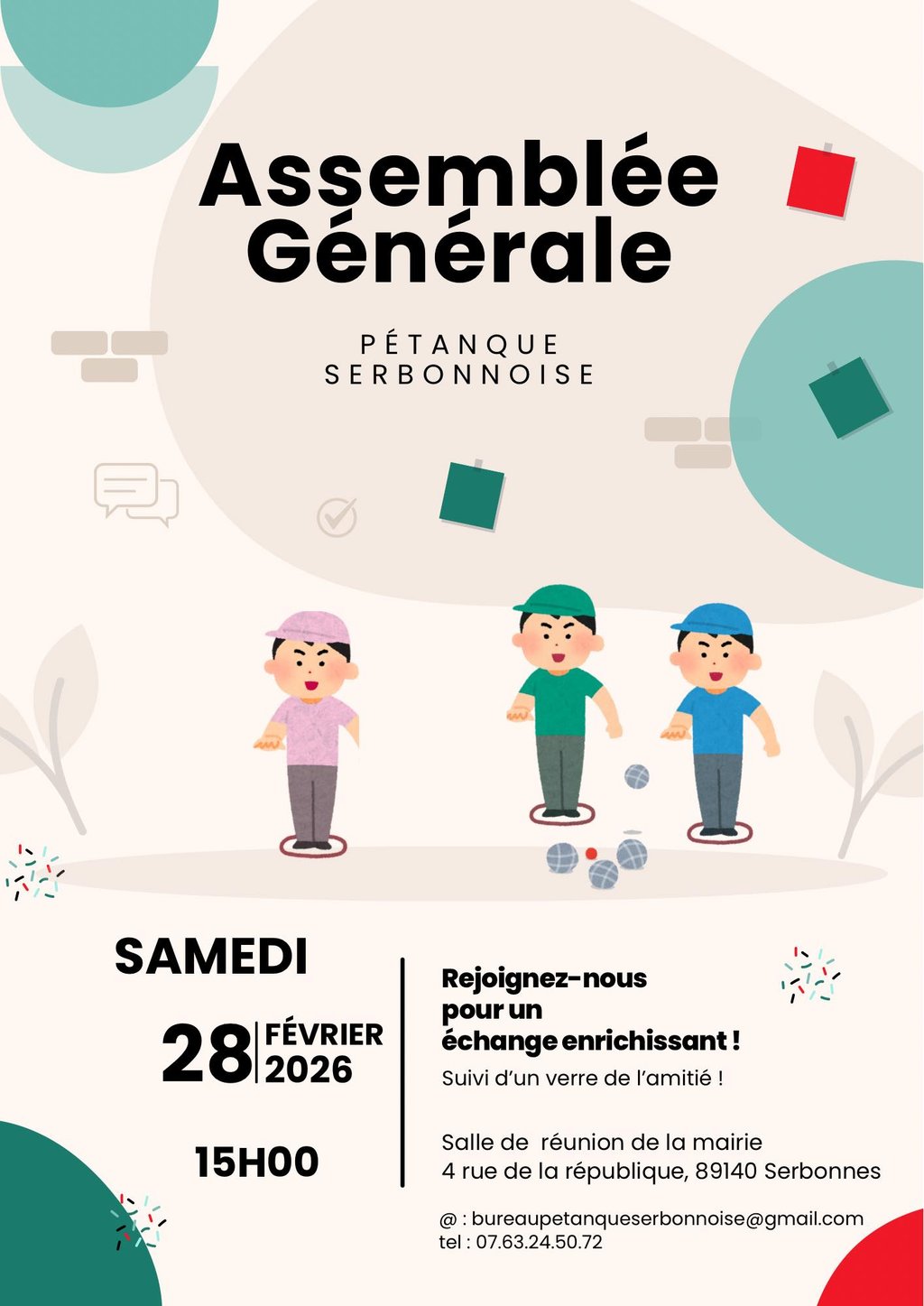 L’association Pétanque Serbonnoise tiendra son Assemblée Générale le samedi 28 février 2026 à 15 h 00 dans la salle de réunion de la Mairie de Serbonnes.