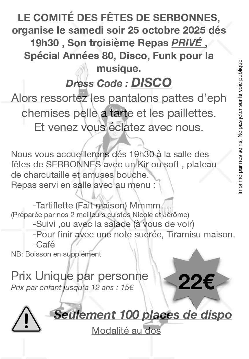 Le Comité des Fêtes de Serbonnes vous donne rendez-vous pour son 3ᵉ repas privé spécial Années 80 !