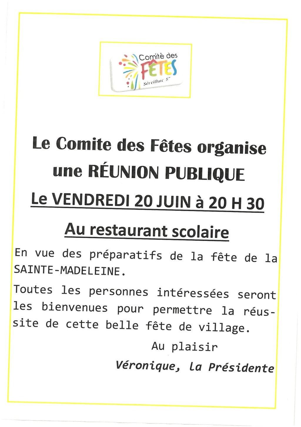 REUNION PUBLIQUE - COMITE DES FETES - 20 JUIN 20 H 30 RESTAURANT SCOLAIRE - PREPARATION FETE DE LA SAINTE MADELEINE
