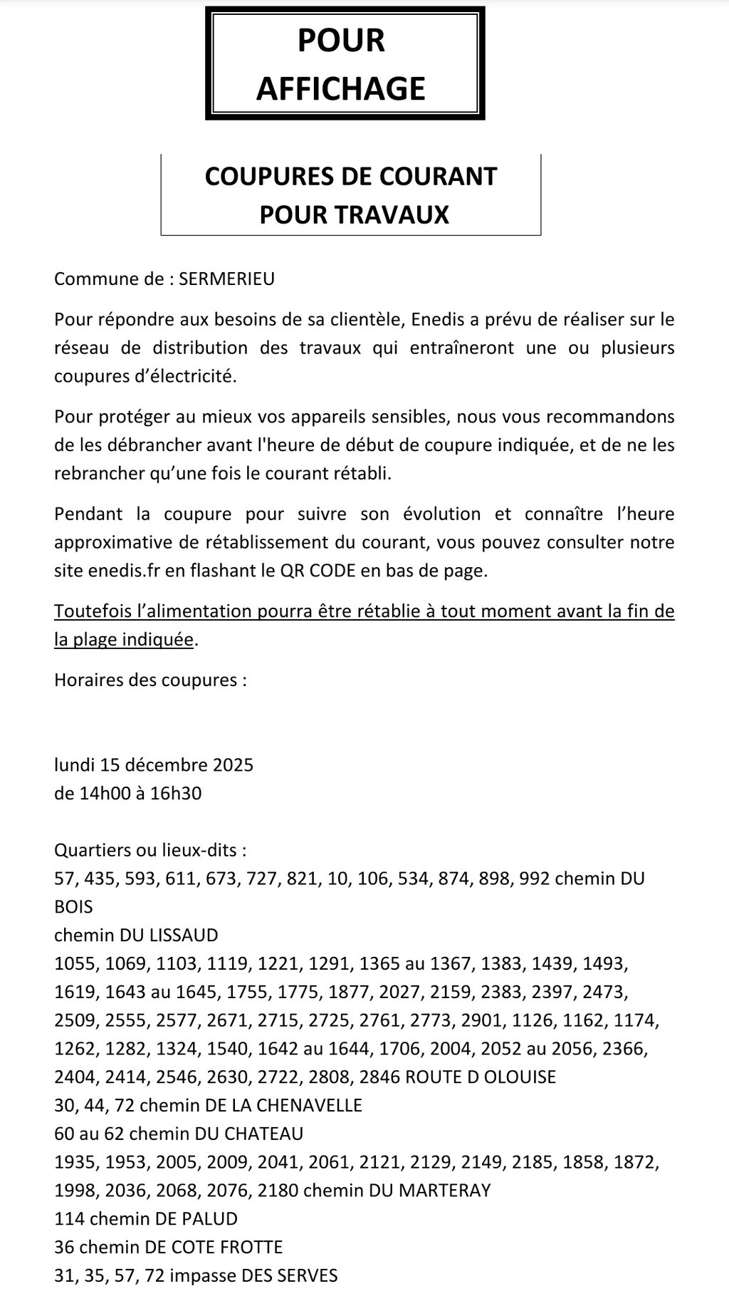 ENEDIS COUPURE D'ÉLECTRICITÉ LE 15 DÉ...