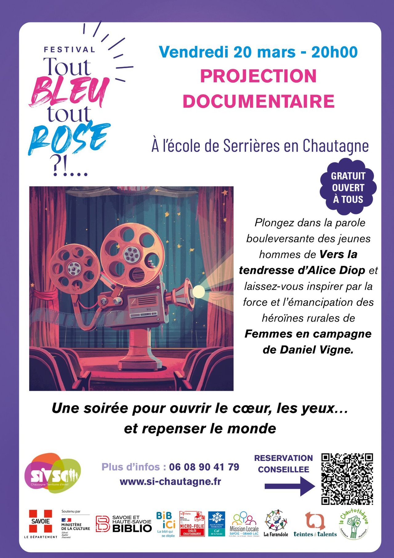 Le festival « Tout bleu tout rose ?!... » poursuit son aventure avec une projection documentaire. En participant à cette soirée, vous découvrirez deux films proposés par notre partenaire Savoie et Haute‑Savoie Biblio, dans le cadre de l’installation de la Bib’ici à l’école de Serrière‑en‑Chautagne.