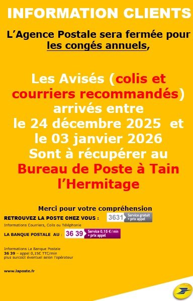 Les Avisés (colis et courriers recommandés) arrivés entre le 24 décembre 2025 et le 03 janvier 2026 sont à récupérer au Bureau de Poste à Tain l’Hermitage.