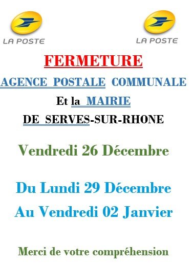 La mairie et l'agence postale communale seront fermées pour les congés de Noël :