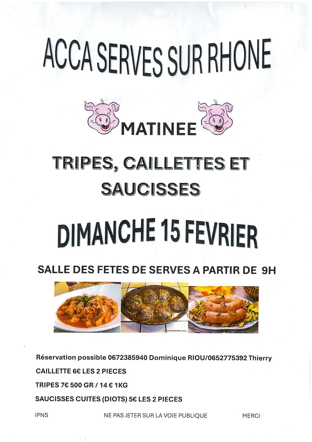 L'ACCA vous propose une matinée tripes, cailettes et saucisses le dimanche 15 février à partir de 9H à la salle "La Route Bleue".