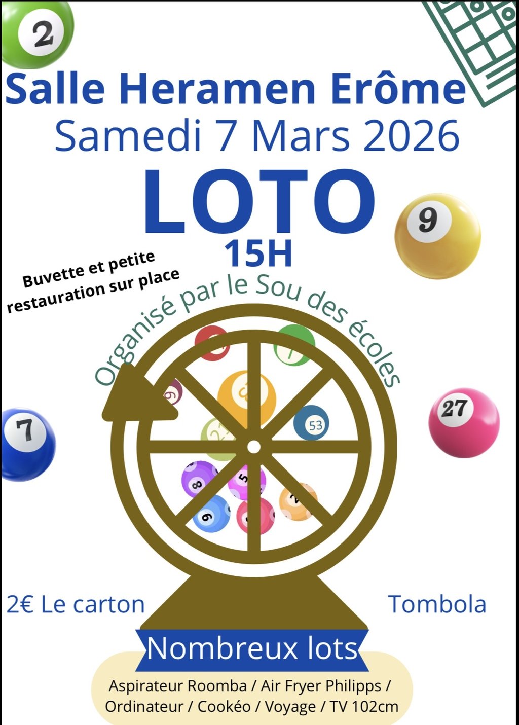 Le Sou des écoles du RPI de Serves Gervans Erome organise son loto annuel le Samedi 7 Mars à Erome à la salle Heramen à 15h00. Ouverture des portes à partir de 14h00. Vente de cartons et de tombola sur place. Buvette et restauration rapide sur place.