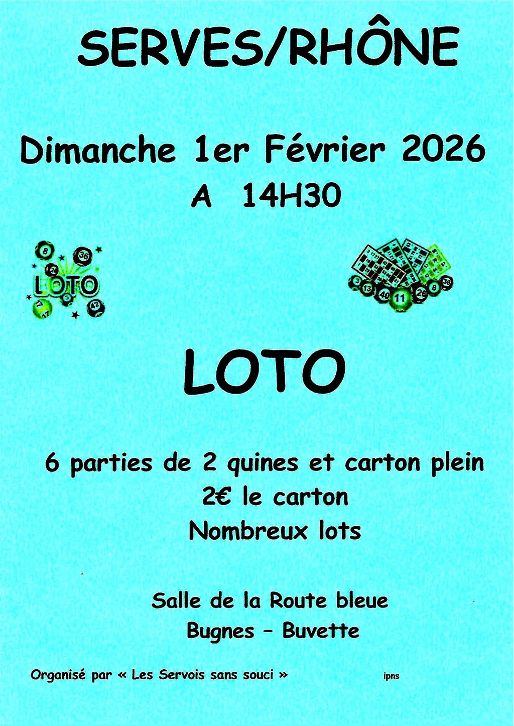 Les Servois sans souci organisent leur Loto le Dimanche 1er Février à 14h30 à la salle La Route Bleue.