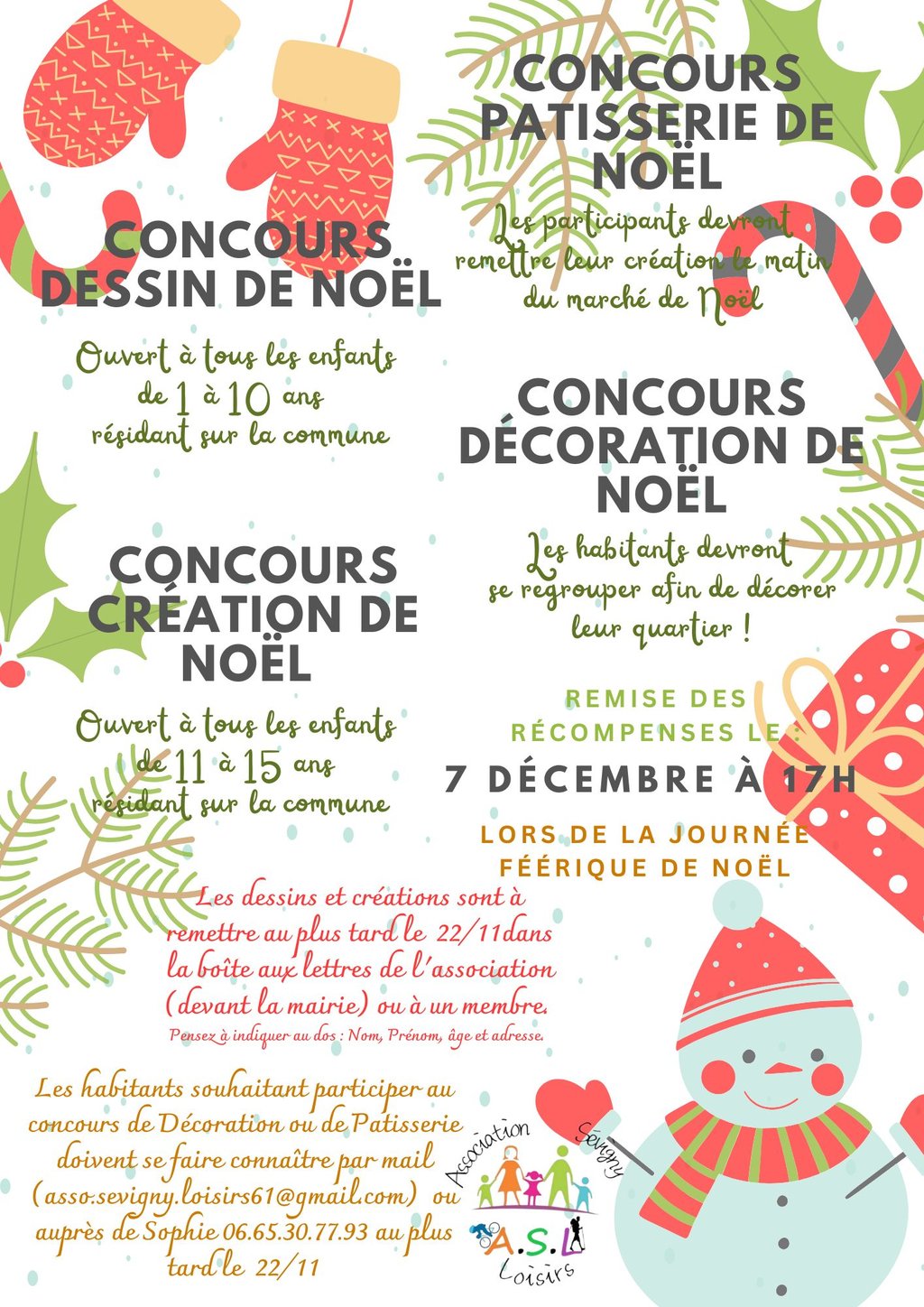 👨👩👧👦🍪 Concours de pâtisseries de Noël (ouvert à tous) Faites saliver le jury avec vos douceurs sucrées ! Inscription avant le 22 novembre par mail 📧 (asso.sevigny.loisirs61@gmail.com) ou auprès de Sophie 📞 au 06.65.30.77.93. Apportez vos délices le dimanche 7 décembre au matin sur notre stand au marché de Noël.