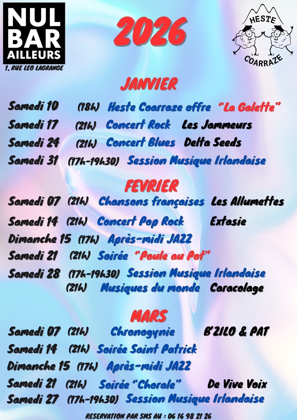 Voici le programme des animations au "Nul Bar Ailleurs" pour le 1ᵉʳ trimestre 2026.