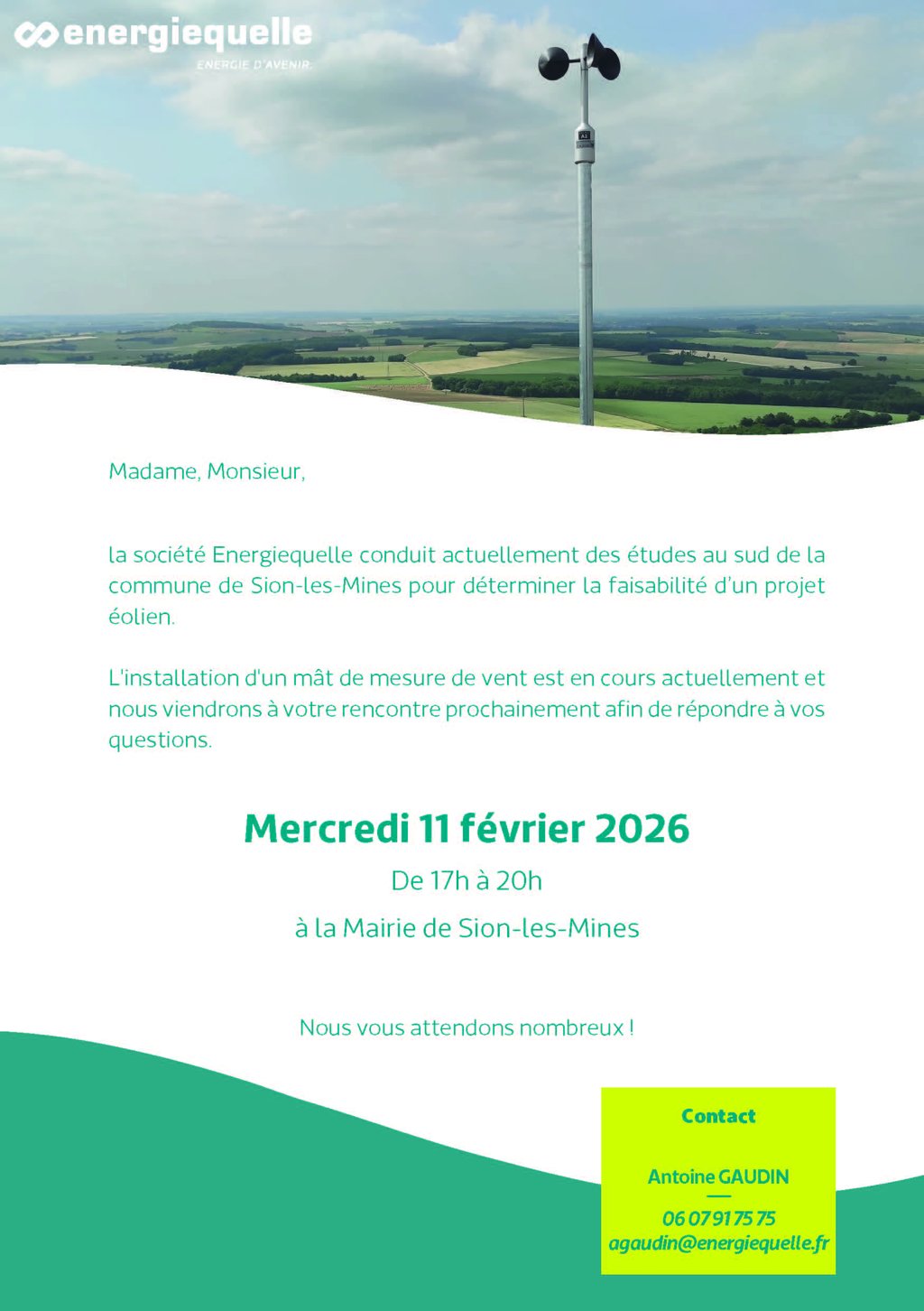 Une permanence d’information sur le projet éolien de Sion-les-Mines et l’installation du mât de mesure de vent qui aura lieu le mercredi 11/02/26 à la salle nord de la mairie.