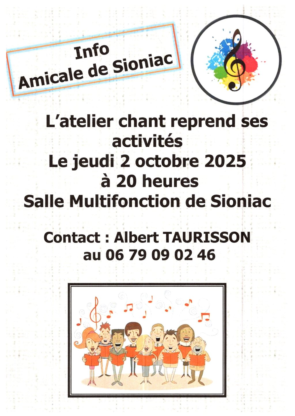 L'Amicale de Sioniac vous informe que l'Atelier Chant reprend ses activités à compter du 2 octobre 2025 à 20.00.