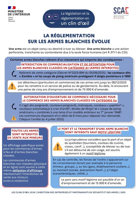 Dans un objectif de renforcement de la sécurité publique et de prévention des violences impliquant des armes blanches, la réglementation relative à leur vente, détention et port a été modifiée par l’arrêté du 4 juillet 2025 et le décret n° 2025-894 du 5 septembre 2025, à la suite du rapport de la mission « Mineurs et armes blanches » remis au Premier ministre le 28 mai 2025.