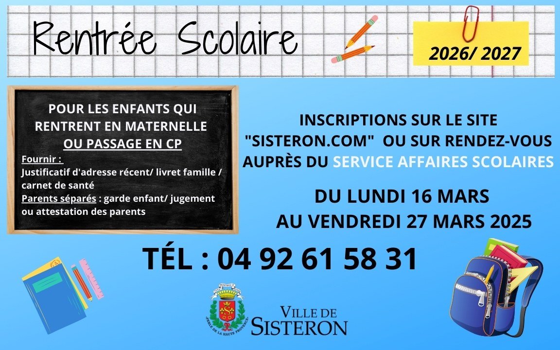 Le formulaire d’inscription de la rentrée scolaire 2026/2027 pour les enfants qui entreront en maternelles ou au CP à Sisteron sera disponible du lundi 16 mars au vendredi 27 mars sur le site de la Ville de Sisteron via le lien suivant : https://urls.fr/R02Hiy.