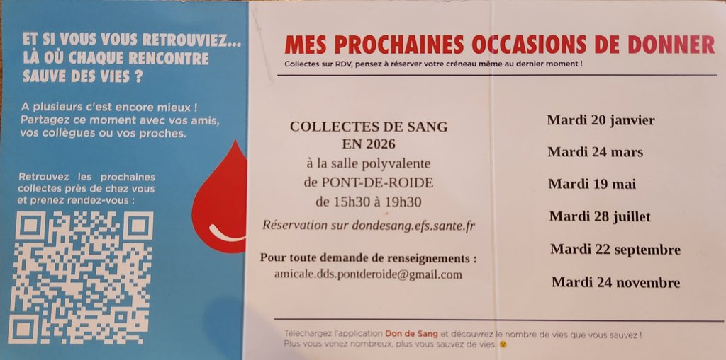 CALENDRIER COLLECTES DE SANG 2026 - AMICALE DES DONNEURS DE SANG BÉNÉVOLES DE PONT-DE-ROIDE-VERMONDANS ET ENVIRONS