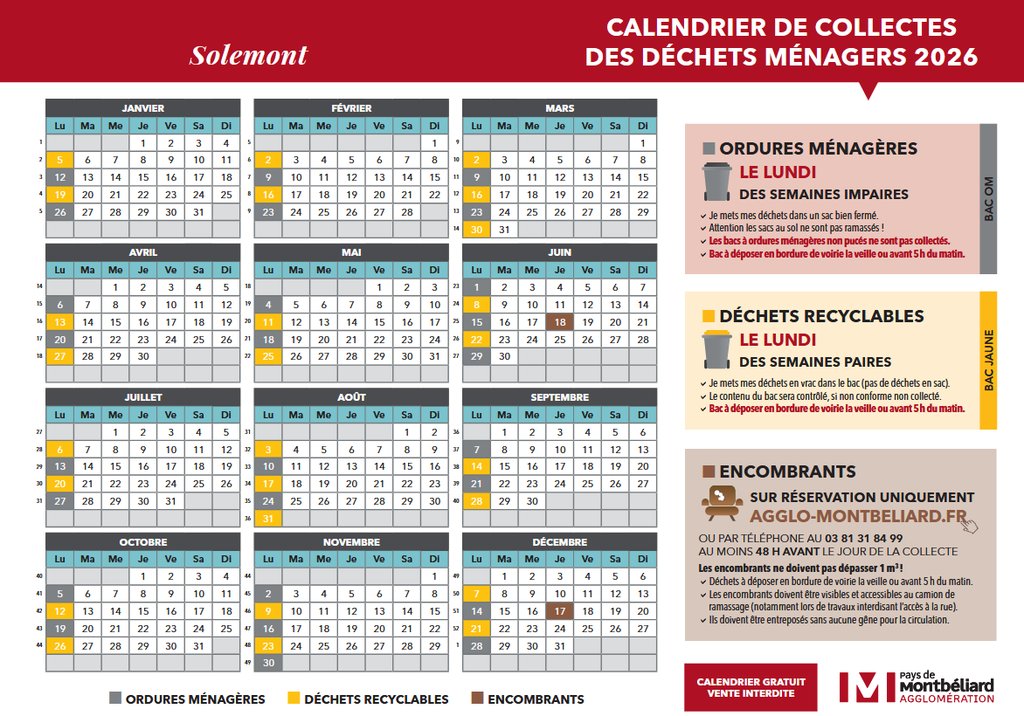 Pays de Montbéliard Agglomération informe les habitants que les calendriers de collecte des déchets pour l’année 2026 sont désormais disponibles.