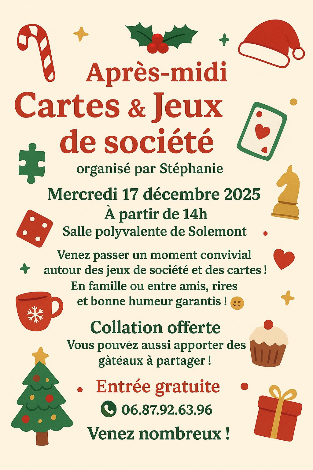 🎄 APRÈS-MIDI CARTES & JEUX DE SOCIÉTÉ 🎄MERCREDI 17 DÉCEMBRE 2025 À 14H - BIBLIOTHÈQUE SOLEMONT