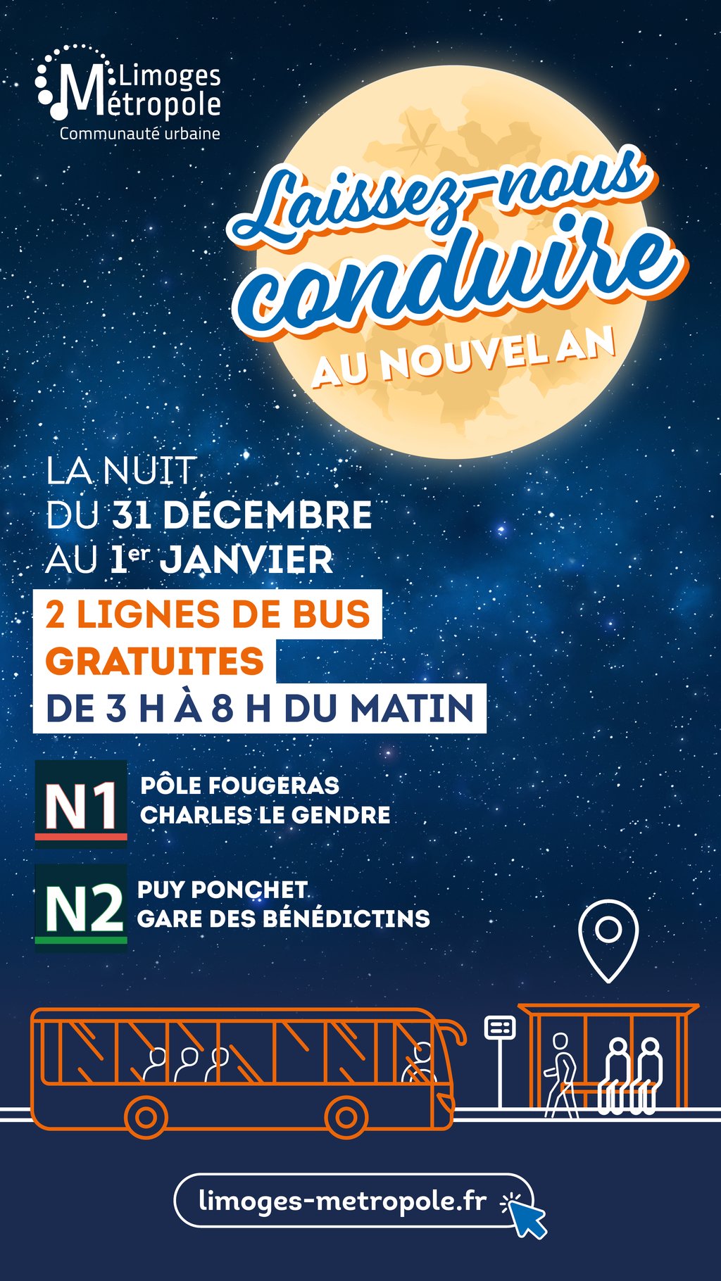 📍 Dans la nuit du 31 décembre 2025 au 1er janvier 2026, Limoges Métropole proposera aux usagers des transports en commun deux lignes de bus totalement gratuites.