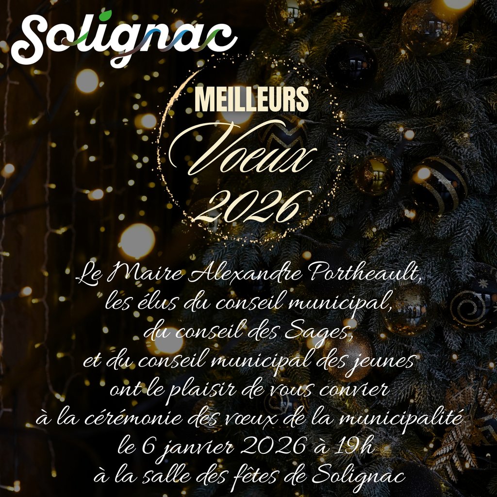 Monsieur le Maire, Alexandre PORTHEAULT, et le Conseil Municipal ont le plaisir de vous convier à la cérémonie des vœux le mardi 6 janvier 2026 à 19h00 à la salle des fêtes de Solignac.