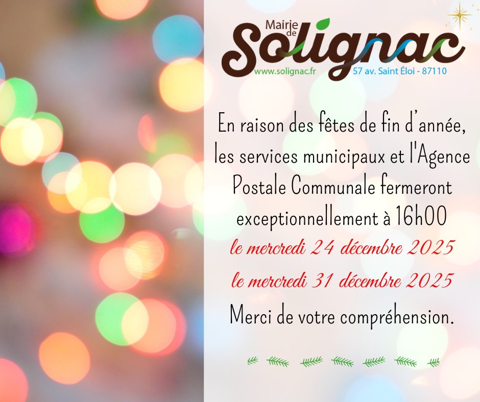 En raison des fêtes de fin d’année, les services municipaux et l'Agence Postale Communale fermeront exceptionnellement à 16h00: