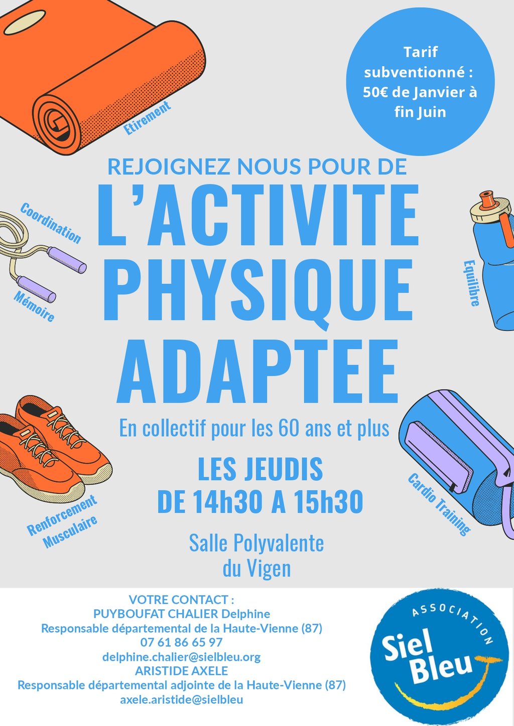 L'association Siel Bleu propose de l'activité physique adaptée les jeudis de 14h30 à 15h30 à la salle polyvalente du Vigen.
