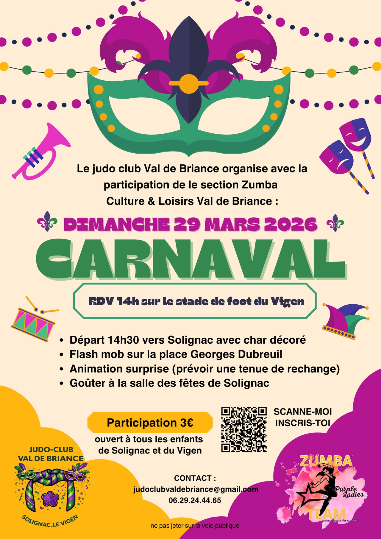 Le judo club Val de Briance avec la participation de la section Zoumba de Culture et Loisirs Val de Briance organise un carnaval le dimanche 29 mars 2026 !