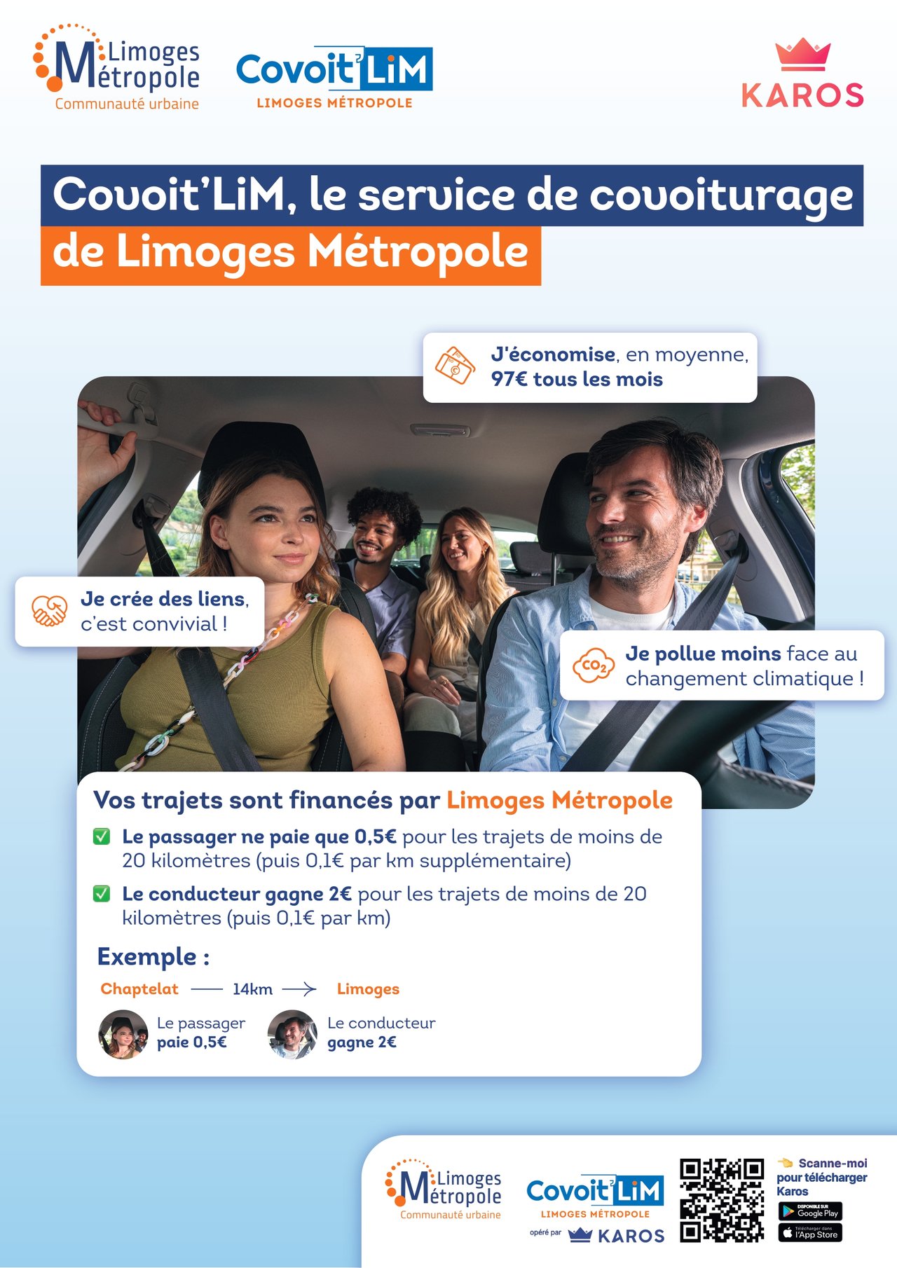 Afin d’encourager les usagers, Limoges Métropole propose une nouvelle solution de covoiturage : COVOIT’LiM, un nouveau service en partenariat avec l’opérateur national Karos, pour une durée expérimentale de 8 mois.