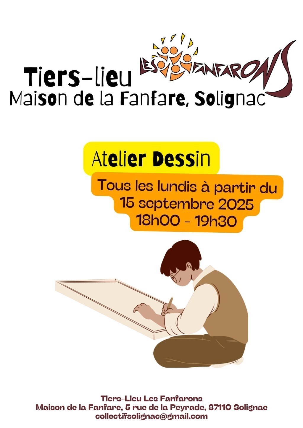 Nous lançons pour l'année 2025-2026 un atelier dessin au tiers-lieu Les Fanfarons, à la Maison de la Fanfare de Solignac, ouvert à toutes et à tous. Envie de prendre un crayon et de partager un moment créatif ? Rejoignez cet atelier dessin tous les lundis de 18h00 à 19h30, à partir du 15 septembre 2025