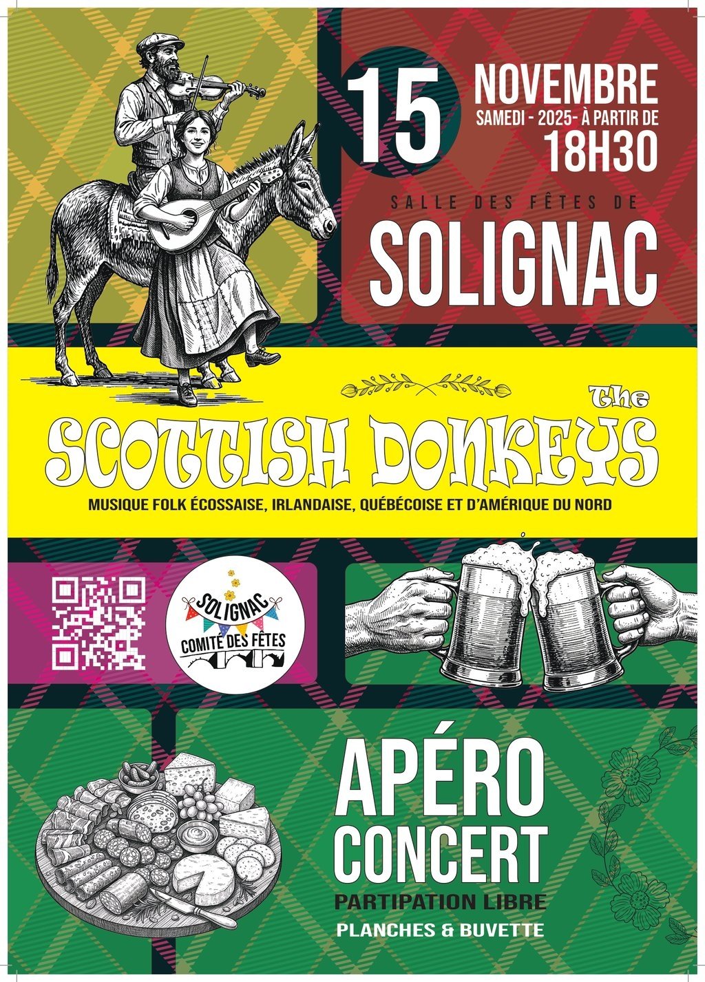 Vous irez sans doute vous régaler le 1er novembre à l'Huître en Fête, vous assisterez peut-être à la soirée théâtre vendredi 8 novembre avec Roudoudou ! Mais ne manquez pas l'Apéro-concert avec les Scottish Donkeys samedi 15 novembre à la salle des Fêtes de Solignac !!! Un répertoire varié de musique folk écossaise, irlandaise, du Québec et du nord des États-Unis. Belles voix, violons, guitare, banjo, basse pour une fête comme dans les pub.