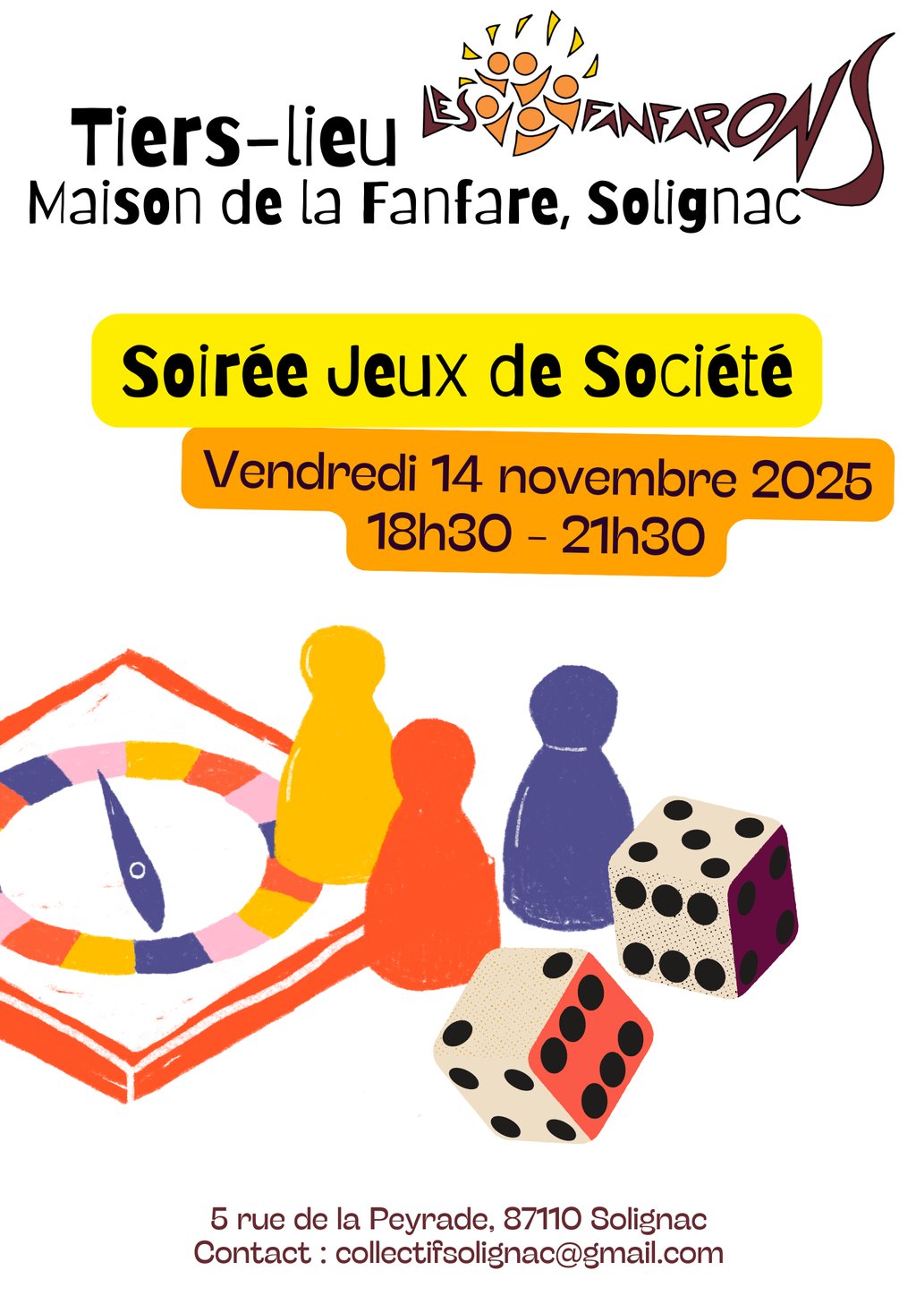 La soirée jeux de société est de retour ! Envie de rire, de jouer, de rencontrer du monde et de passer un bon moment ? Ne manquez pas notre soirée jeux de société au tiers-lieu Les Fanfarons à Solignac !