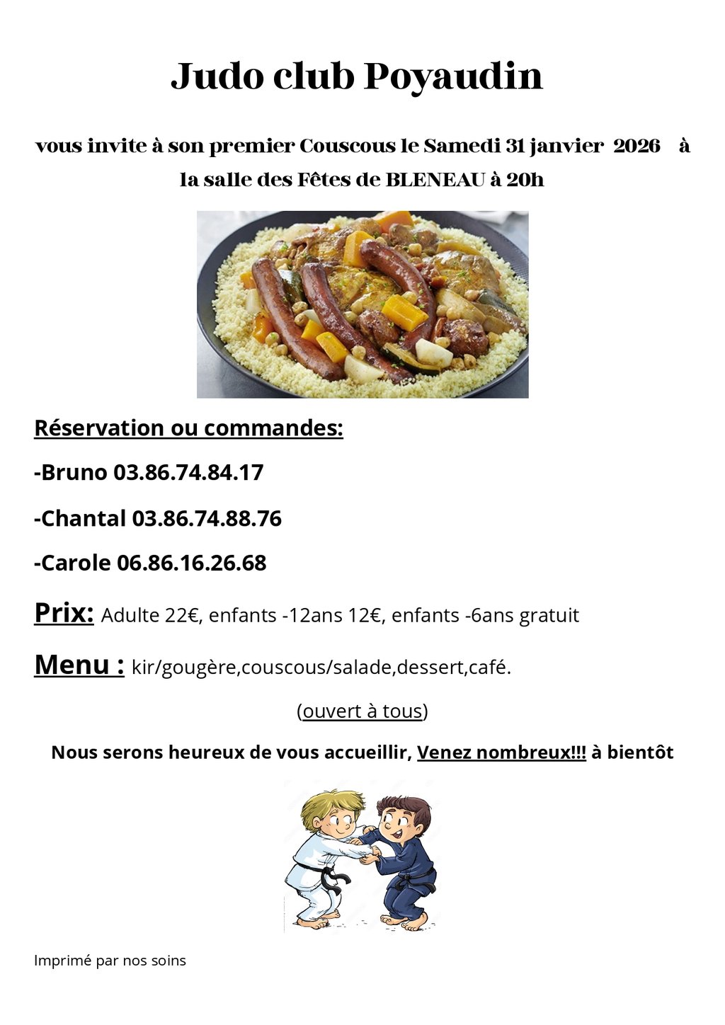 Le judo-club poyaudin vous invite à son premier Couscous le samedi 31 janvier 2026 la salle des fêtes de Bléneau, à 20h.