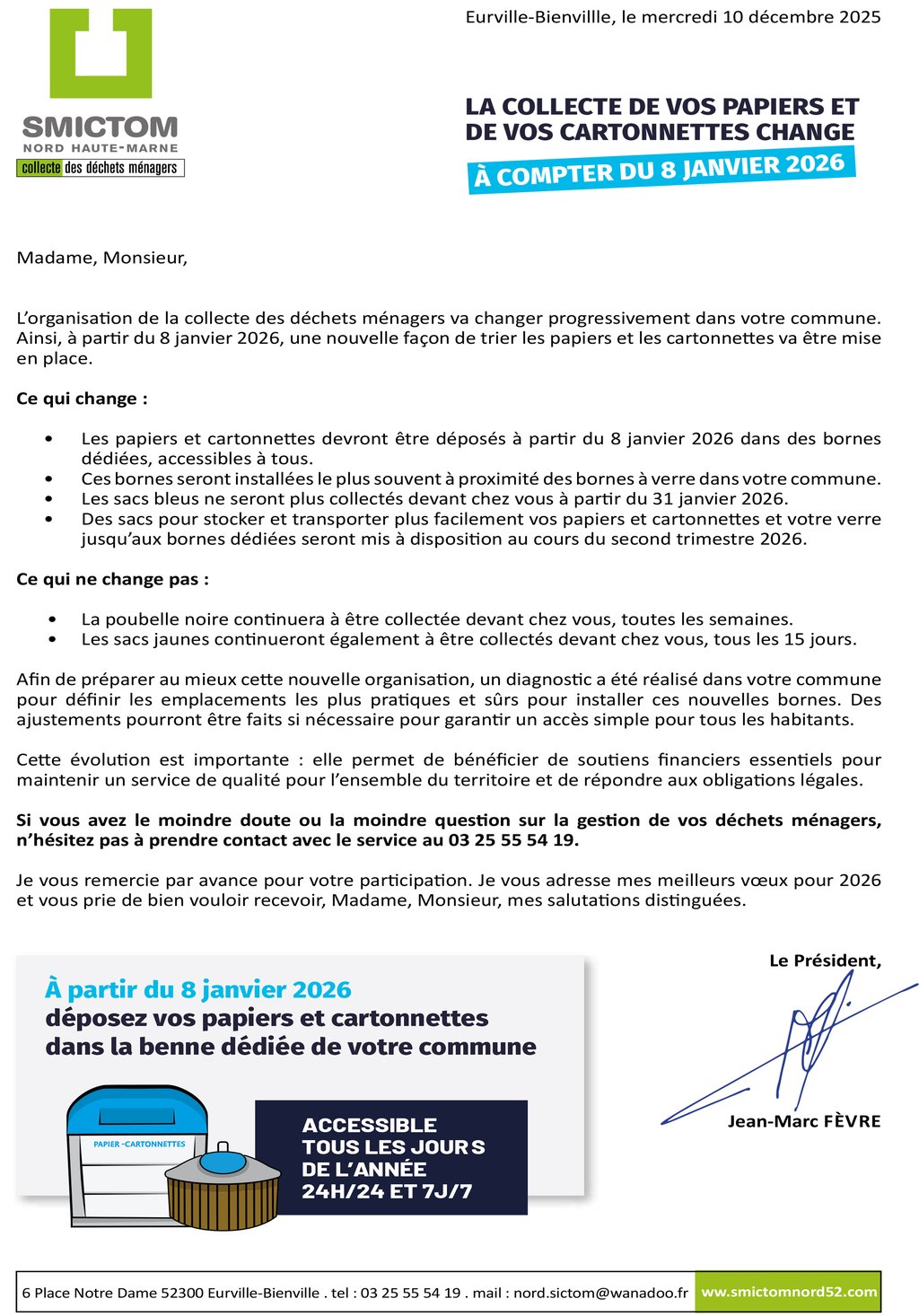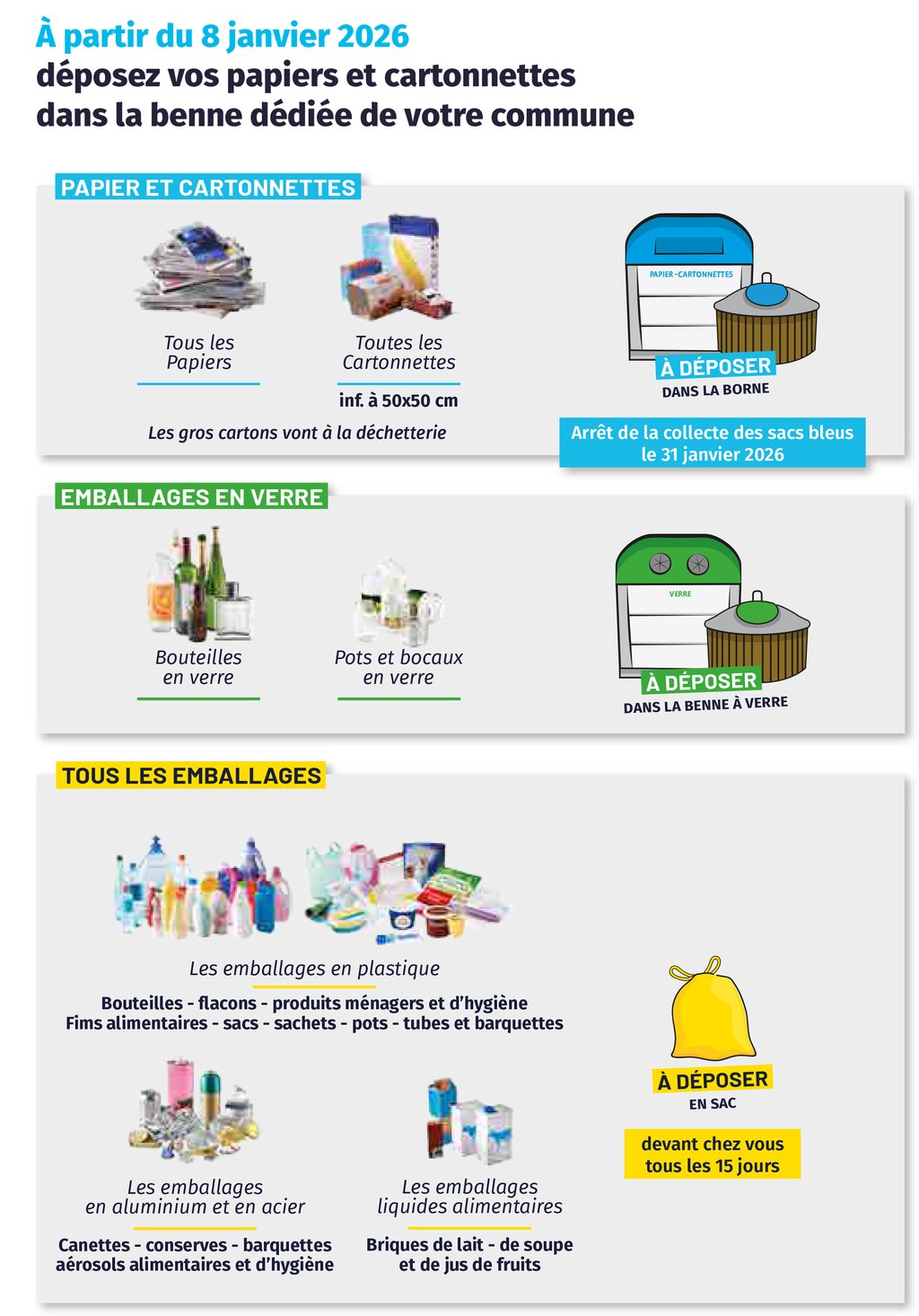 À partir du 8 janvier 2026, la collecte du papier et des cartonnettes (sacs bleus) se fera exclusivement en apport volontaire aux bennes qui seront installées prochainement :