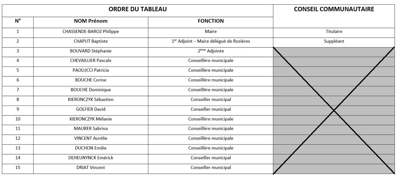 Ordre du tableau du Conseil Municipal suite au conseil qui a eu lieu