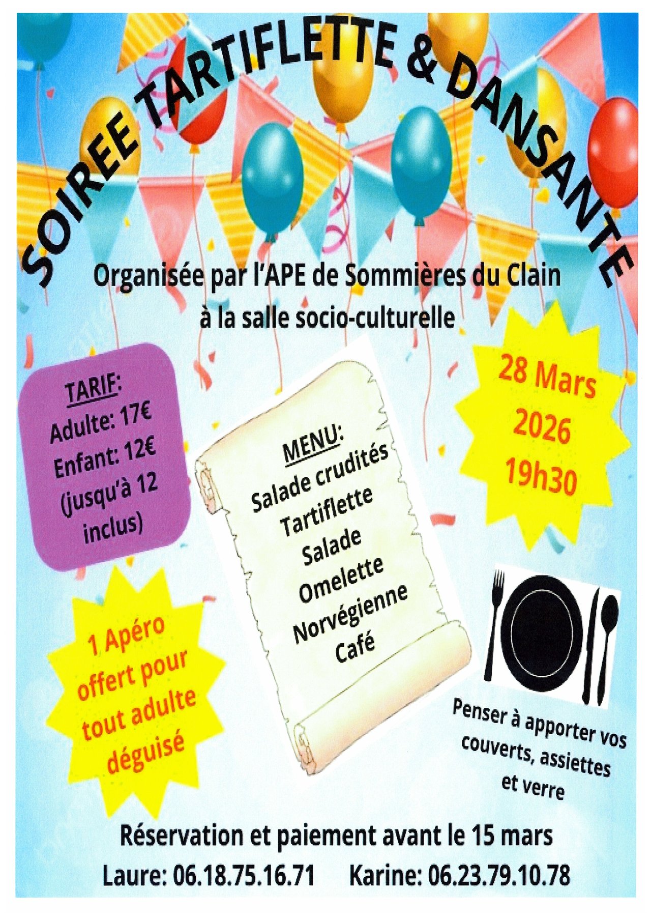Soirée tartiflette et dansante organisée par l'APE le 28 Mars 19 h 30 à la salle socio-culturelle