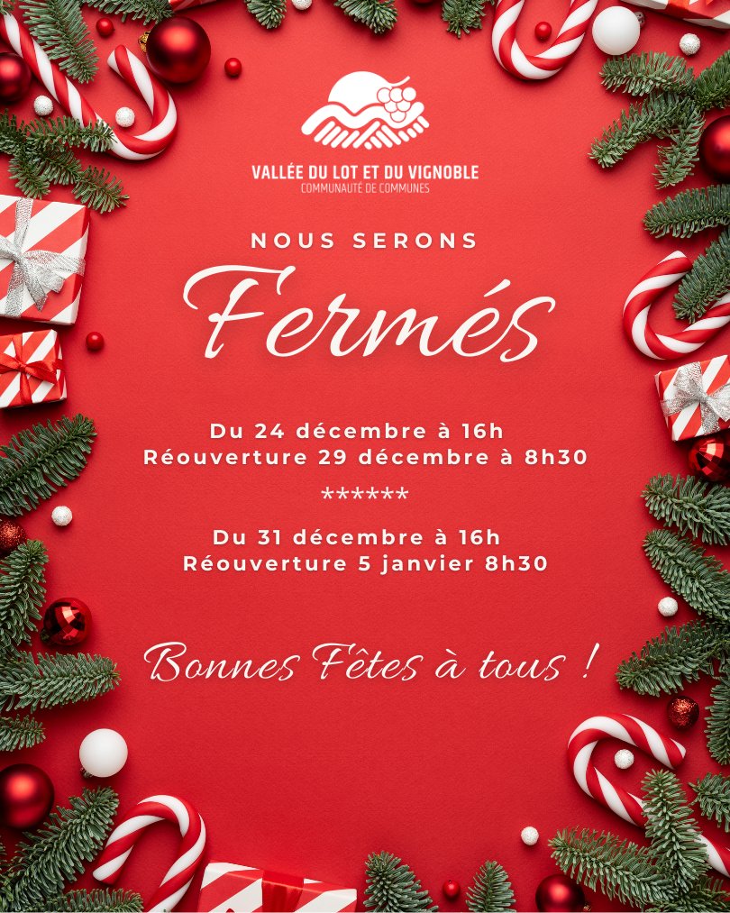 Du mercredi 24 décembre à 16h – Réouverture lundi 29 décembre 8h30