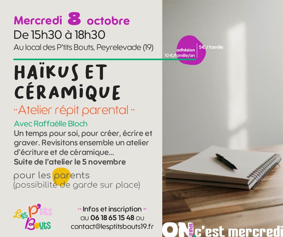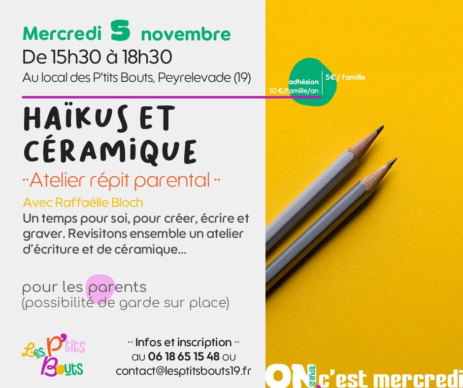 Deux ateliers pour modeler une assiette et y graver un haïkus (poème court japonais) que vous aurez inventé. Ces ateliers vous sont proposés pour prendre le temps de créer et de prendre un temps pour vous.