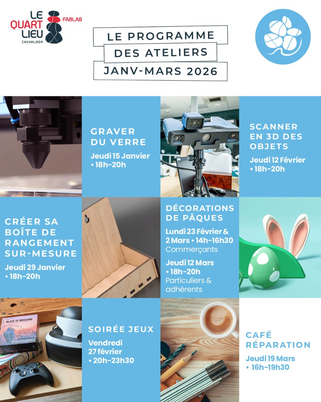 En ce début d’année, le FabLab Cauvaldor vous propose un programme d’ateliers riche et inspirant, de janvier à mars 2026.