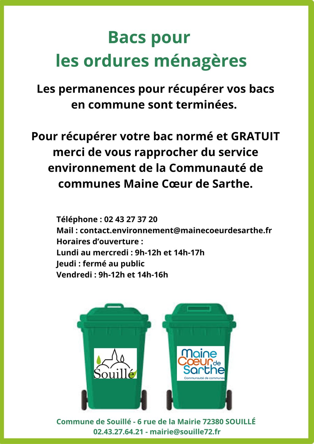Nous vous rappelons qu'à partir du 1er avril, les ordures ménagères ne seront collectées que si elles sont présentées dans les bacs prévus à cet effet.