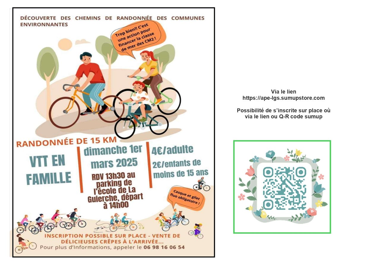 Ce dimanche 1 mars, les parents d’élèves de CM2 de La Guierche organisent une randonnée VTT. Cette action a pour objectif de soutenir financièrement le projet de la CLASSE DE MER pour les élèves en CM2. Venez nombreux soutenir cette belle initiative et profiter de faire du VTT en famille, tout en contribuant à la vie scolaire locale.