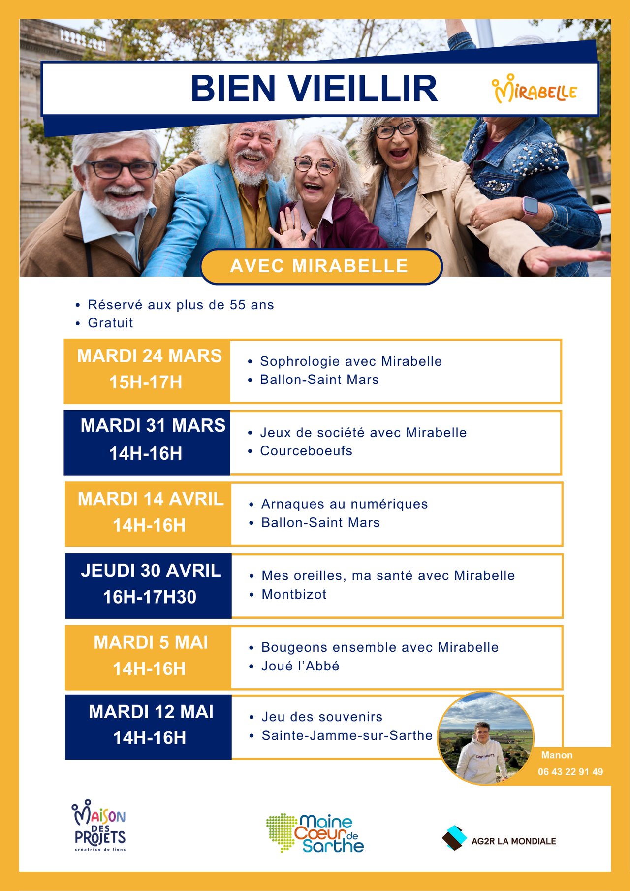 Manon de la Maison des Projets vous propose un cycle d’ateliers spécialement conçus pour les +55 ans, afin de favoriser le bien-être, la convivialité et la prévention au quotidien. Manon vient directement à vous avec Mirabelle, la caravane itinérante du territoire.