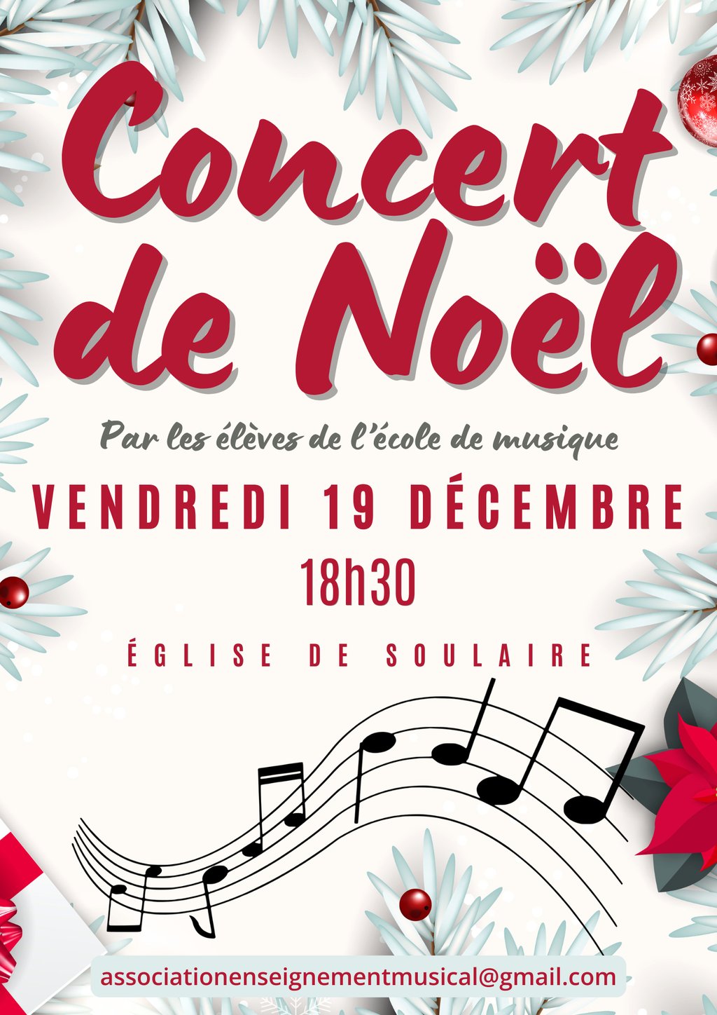 Les élèves seront ravis de vous jouer quelques morceaux de musique de Noël dans l'église de Soulaire en cette fin d'année. À l’issue du concert, vous pourrez rejoindre les festivités à la salle Tabarly, organisées par le comité des fêtes.