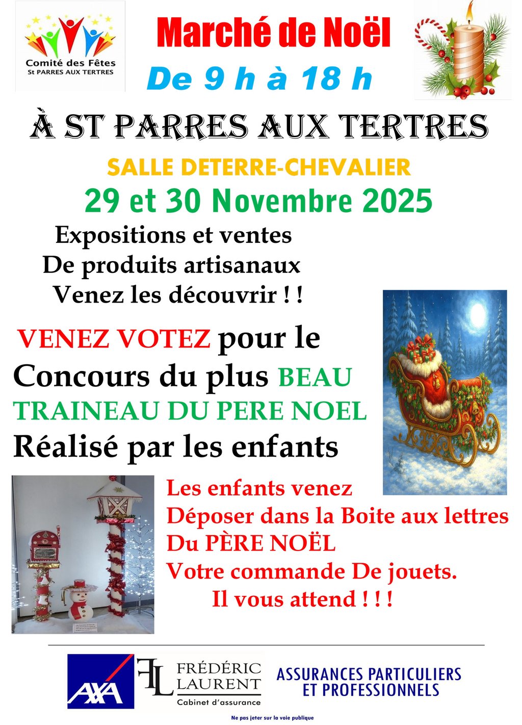 Présence du Père Noël et petite restauration assurée par le Comité des Fêtes (croque-monsieur, frites, crêpes, vin chaud).