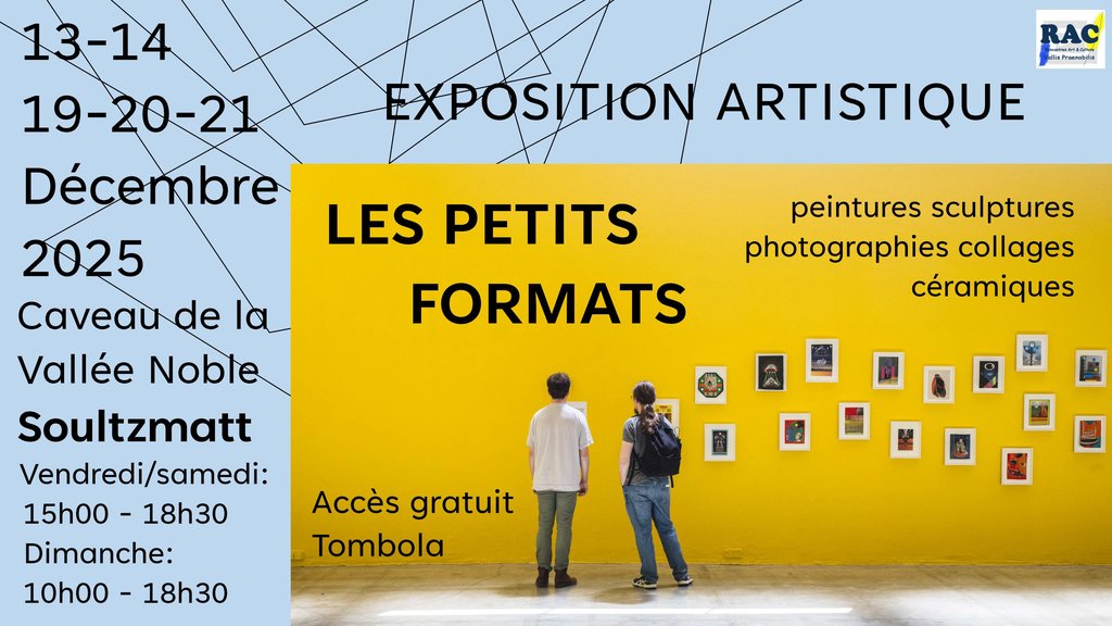L’association RAC – Rencontres Art & Culture de la Vallée Noble organise la 27e édition de son exposition “Les Petits Formats” les 13, 14, 19, 20 et 21 décembre au Caveau de la Vallée Noble, situé à côté de la mairie.