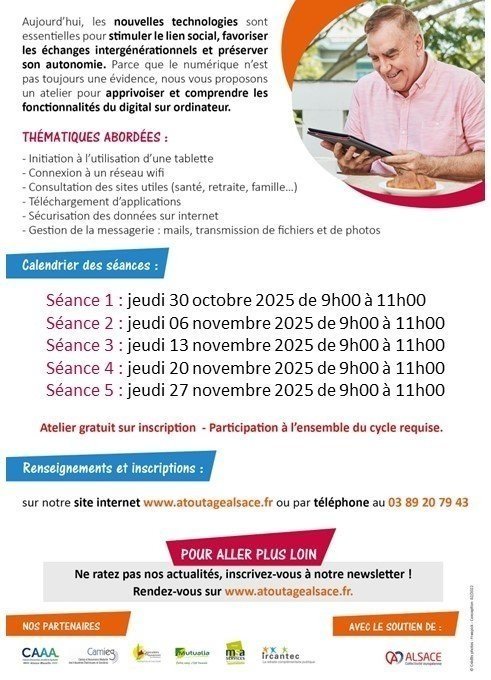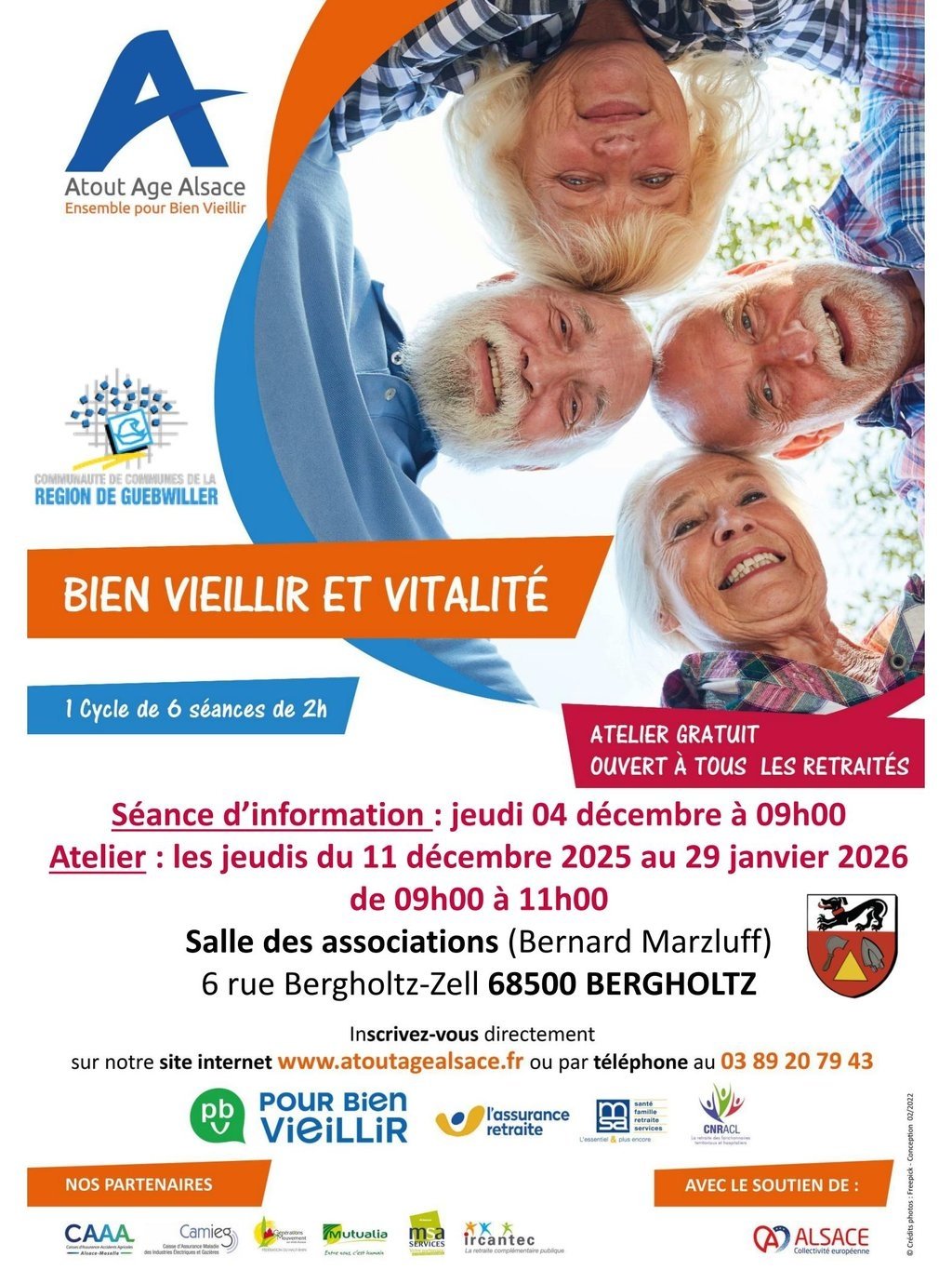 Les ateliers se tiendront du 11 décembre 2025 au 29 janvier 2026, chaque jeudi de 9 h à 11 h, à la Salle des Associations Bernard Marzluff, 6 rue de Bergholtz-Zell à Bergholtz.